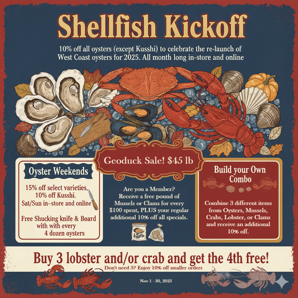 We are re-stocked with all of your favourites. Kusshi, Lighthouse, Royal Miyagi, Petite. Take advantage of terrific savings and combine with Lobster or Crab and save even more!